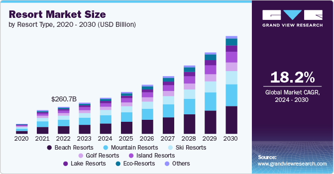 The surge in international travel, as well as the growth of the travel and hospitality industry, has led to the expansion of the global resort industry. People, on average, have more disposable income than a decade ago, causing the global resort market to grow significantly. In 2023, the market stood at around USD 300.03 billion and is expected to grow at a compound rate of 18.2% till 2030. This growth substantiates the increasing demand for resort accommodations worldwide, especially in exquisite and remote locations.